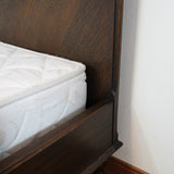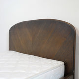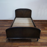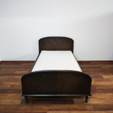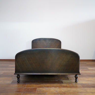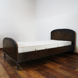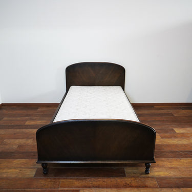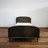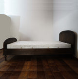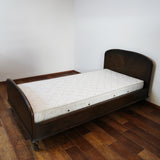 製品紹介:戦前にお作りいただいたベッドで、同じものが2つございます。ワイドシングルという特殊なサイズ感ですが、構造自体は現在お作りしているものと同じような造りとなっております。ヘッドボードとフットボードの寄せ張りの模様が特徴的な貴重な商品です。(※マットレスは商品に含まれておりません)