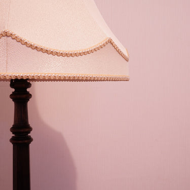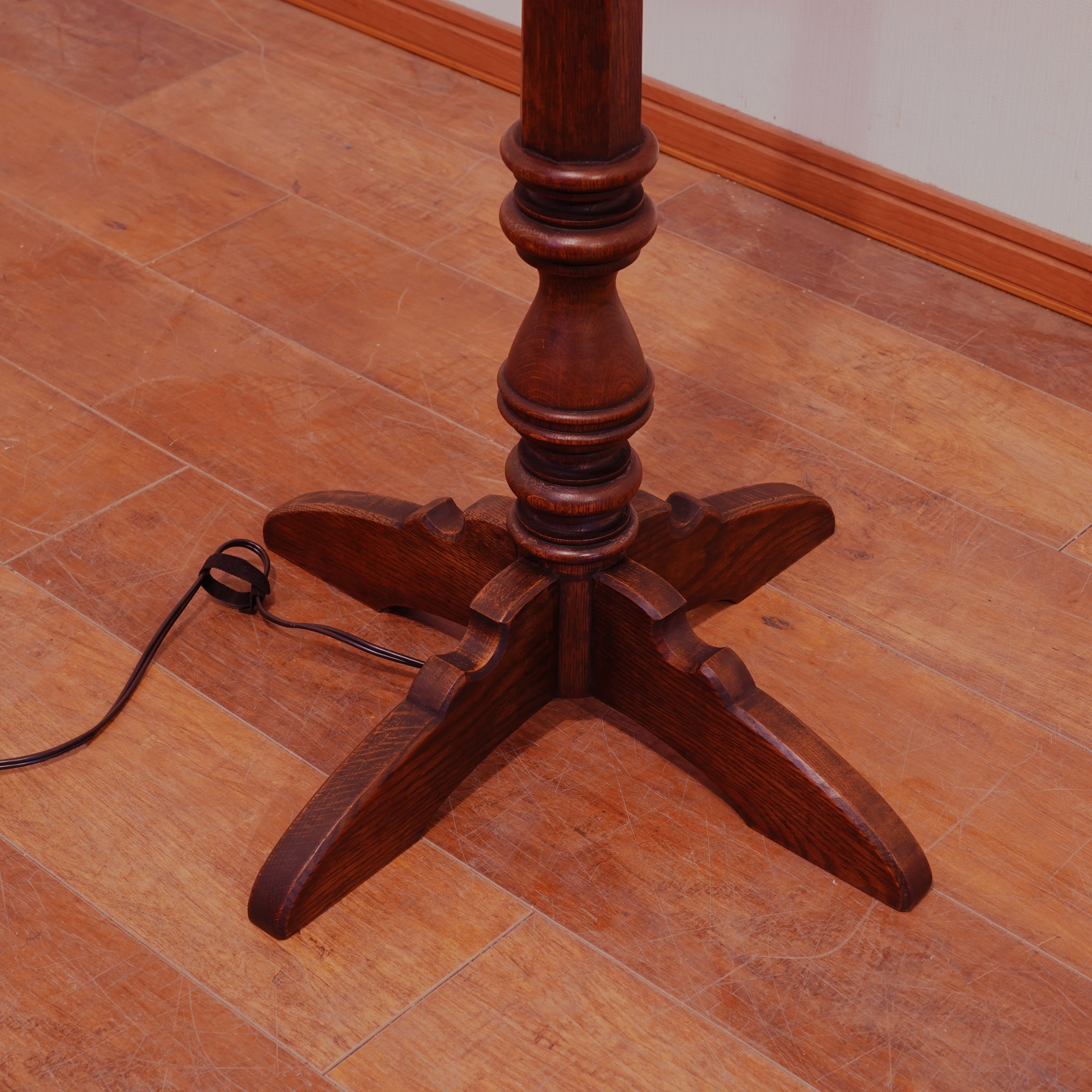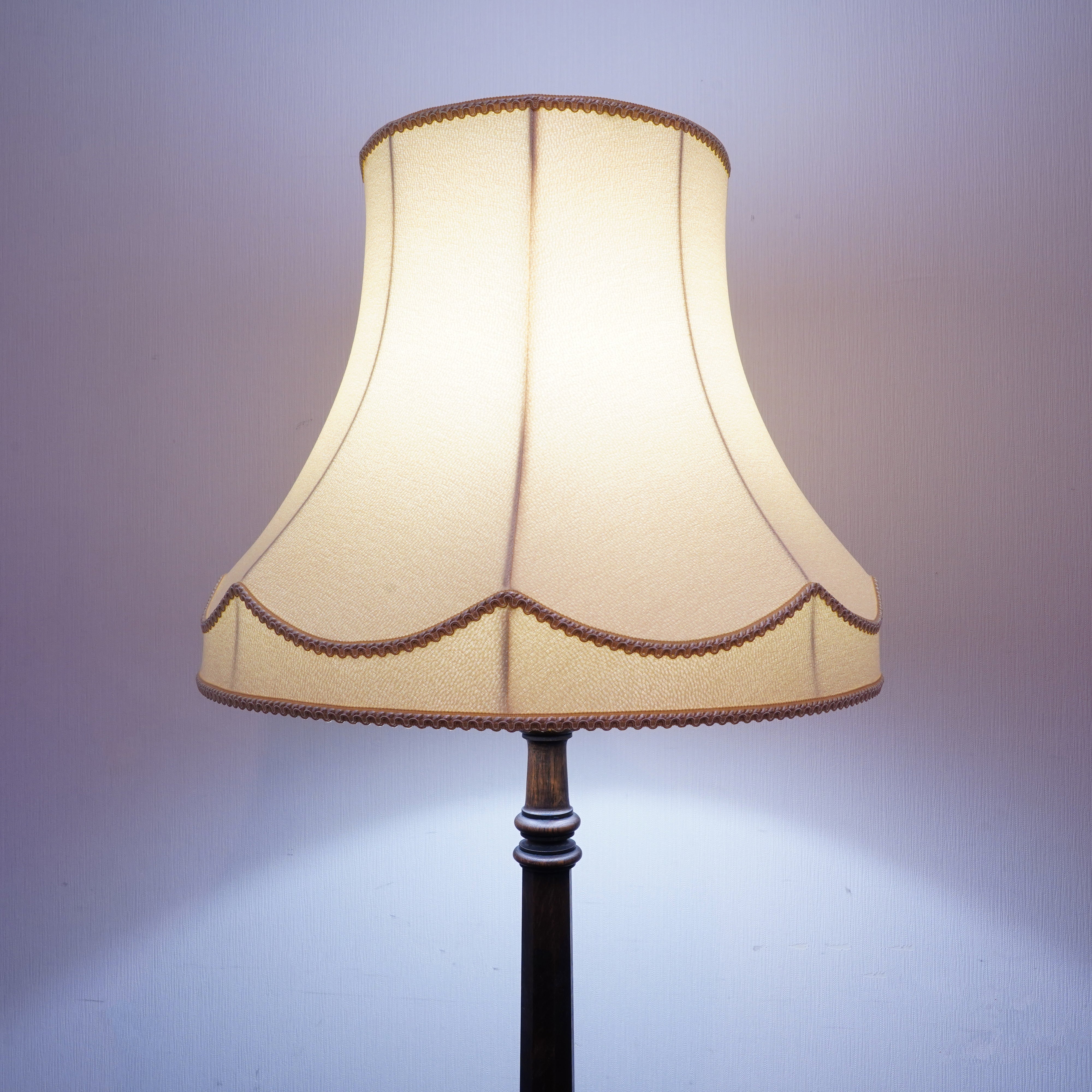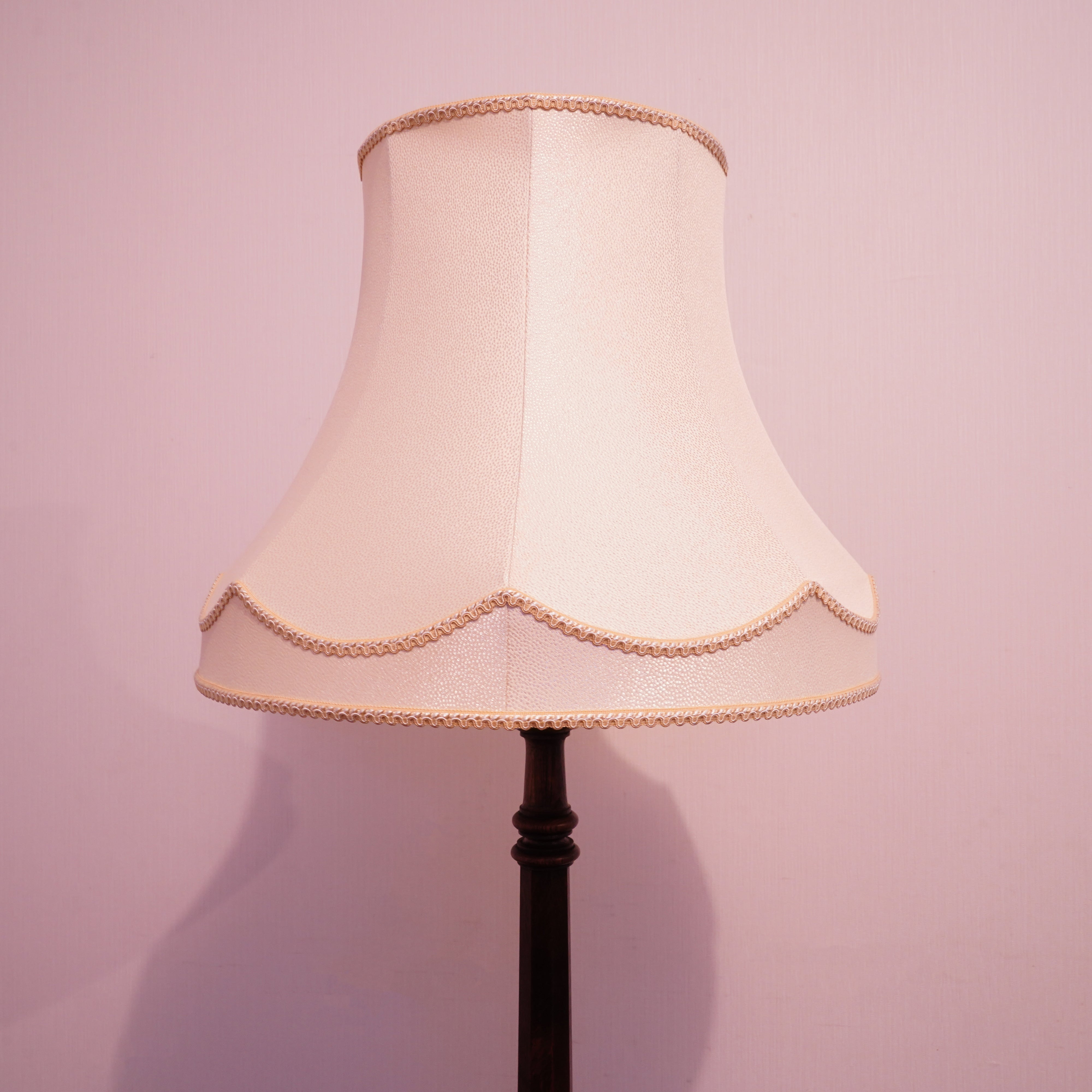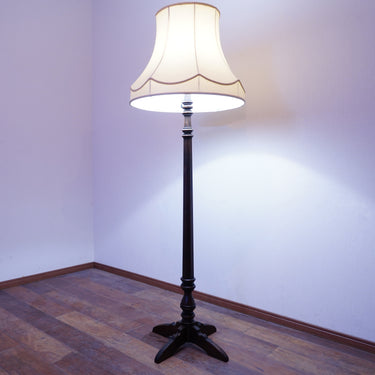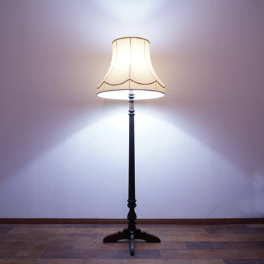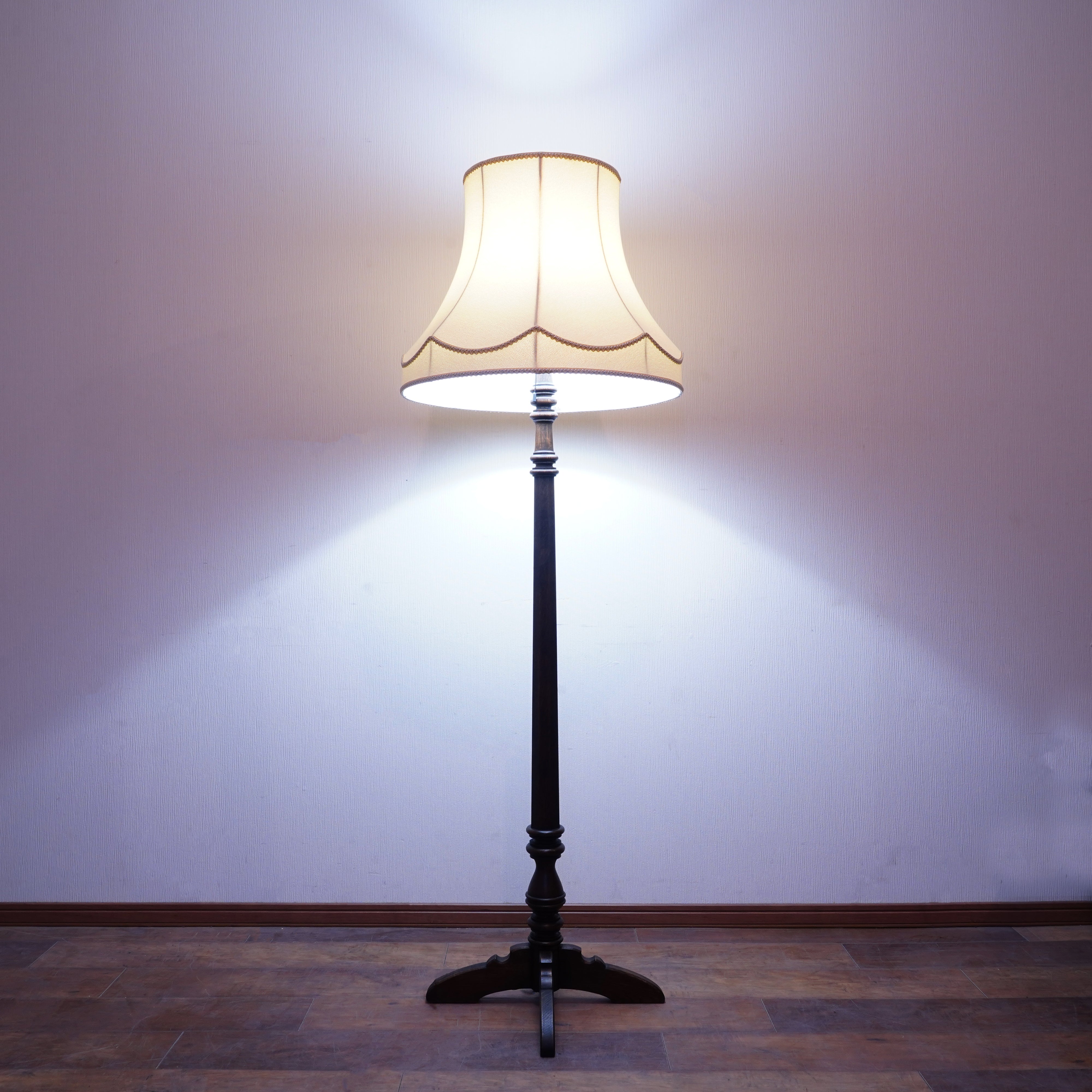 製品紹介:Antique商品として出てくることは珍しいフロアスタンド。六角形とクリモノの組み合わせが印象的な支柱とクラシックなデザインのシェードが美しいバランスとなっております。あえてシンプルな柄のファブリックを合わせ、お部屋にマッチするようなデザインとなっております。