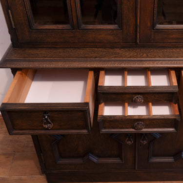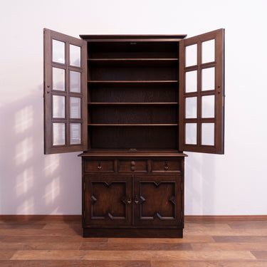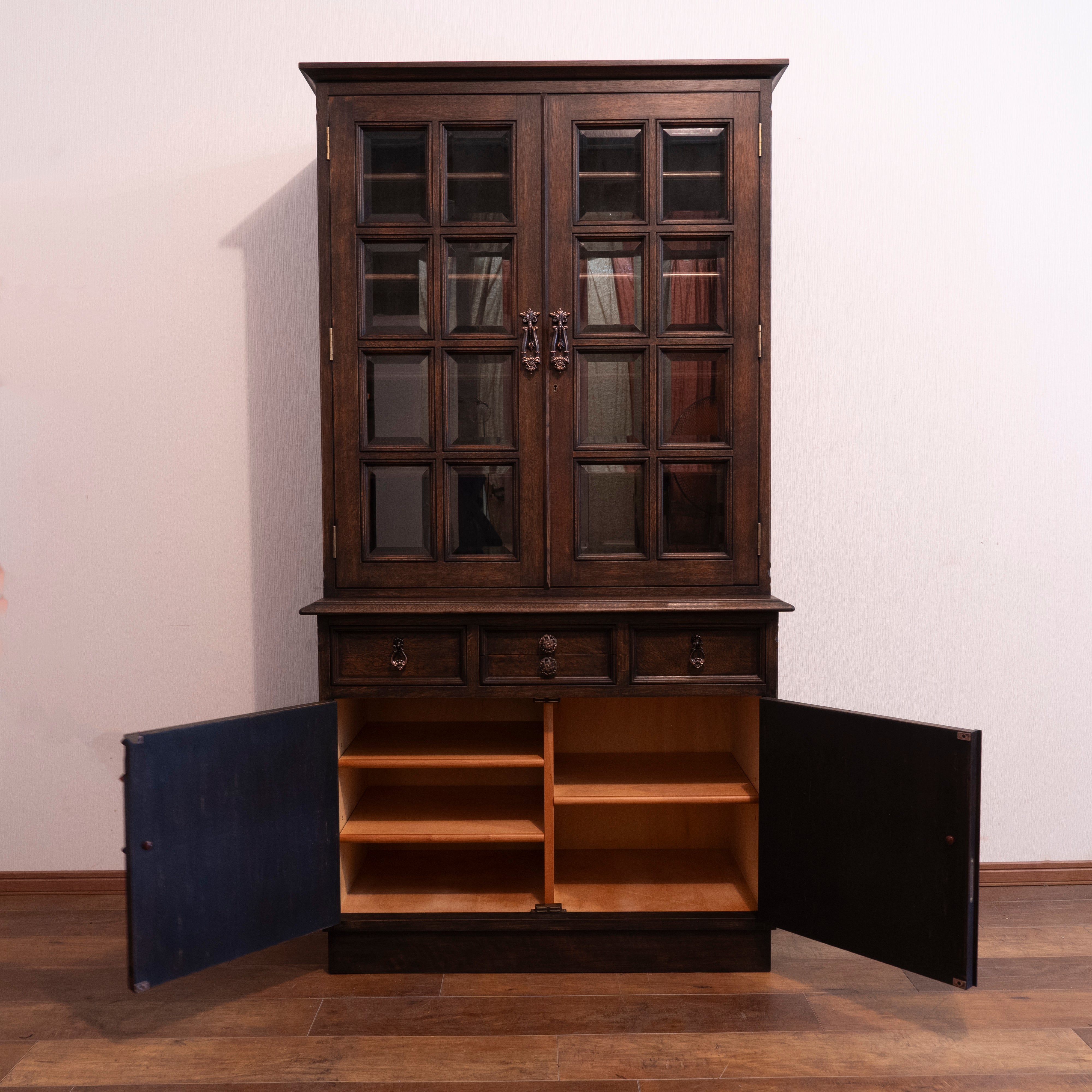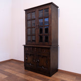 製品紹介:当店で人気の扉のガラスデザインが格子型の食器棚。幅は1mもないにも関わらず、大容量で収納力は抜群です。また、抽斗も細かく分かれており、カトラリー類なども分類して収納していただけます。この食器棚が1つあれば、すっきりと食器類をまとめていただけるかと思います。