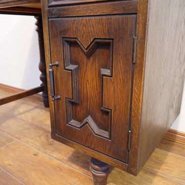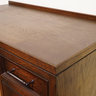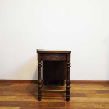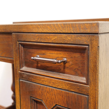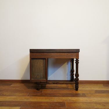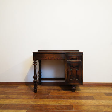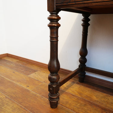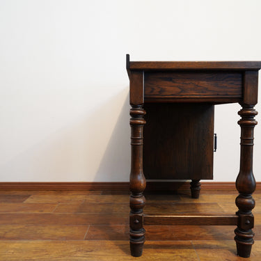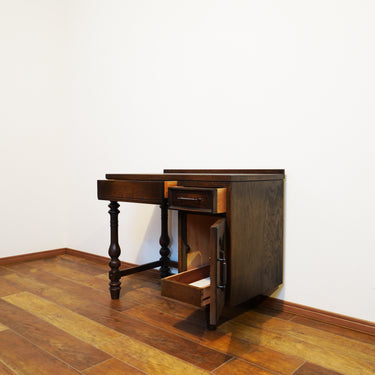 製品紹介:奥行が浅く、ちょっとしたスペースに置いてお使いいただける小型のデスク。もともと鏡台としてお使いいただいていたこともあり、収納力も抜群です。クリモノ脚が特徴的ですが、背面のクリモノは壁にぴったりとつくようにデザインされています。
