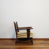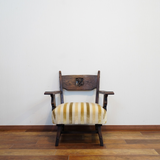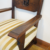 製品紹介:人気のタツの彫刻が背面に彫られた一人掛けのアームチェアです。座面の高さは低めですが、奥行きがしっかりとありますので、男女問わずお使いいただけます。別に掲載しております、二人掛けのタツ型ソファとは色違いの生地を張っておりますので、セットでもお使いいただけます。