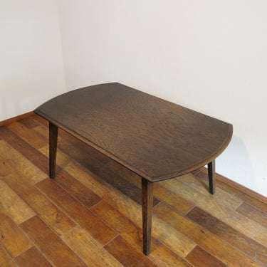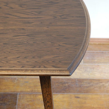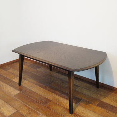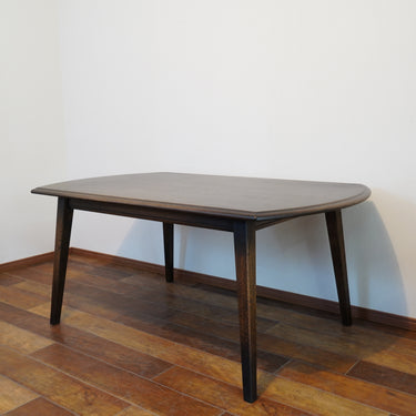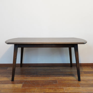 製品紹介:テーブルの両端が半円状のR型になっているのが特徴のダイニングテーブル。天板のRの部分が脚から飛び出しているため、短辺側に座られても広々とお使いいただけます。少し低めのお作りですので、ポロ型ローチェアなどと合わせてお使いいただくのが良いかと思います。