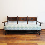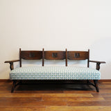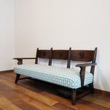 製品紹介:人気のタツの彫刻が背もたれ部分にあしらわれたソファ。3人でゆったりとおかけいただけるサイズ感となっております。張生地は、アウトドアにもお使いいただける生地で、水や汚れ、紫外線にも強い生地となっております。